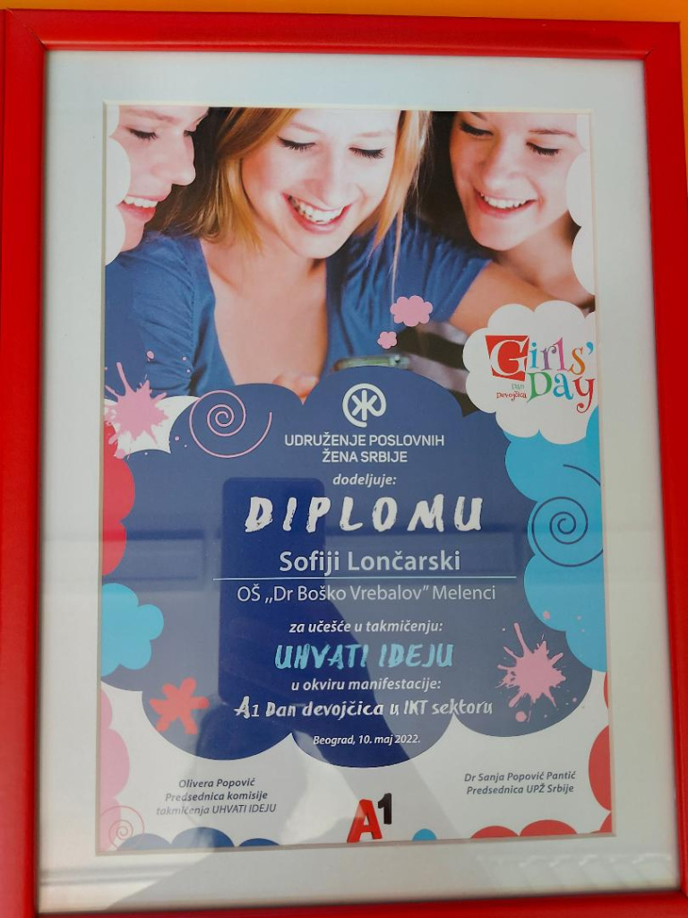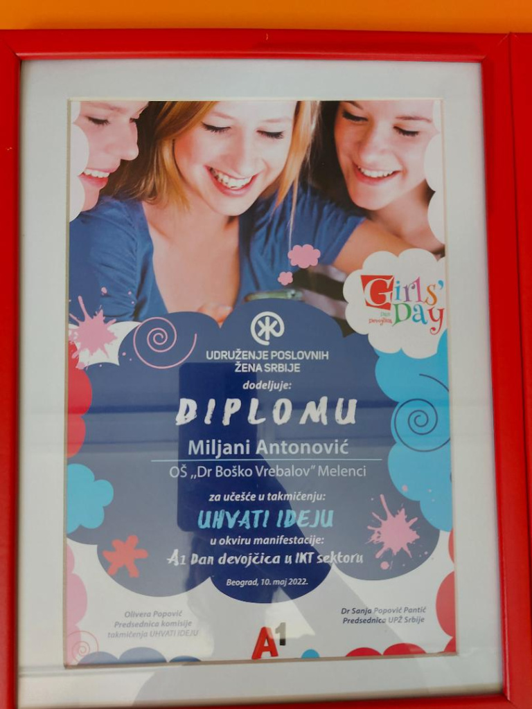У организацији Удружења пословних жена Србије на конкурсу ,,Ухвати идеју'' од 69 пристиглих радова ученице седмог разреда Миљана Антоновић, Нађа Бибин и Софија Лончарски су ушле у финале и пласирале се међу 20 најуспешнијих екипа. Комисију су чиниле представнице УПЖ Србије, МПНТР Србије, МТТТ Србије, МОС Србије, агенције УН Women и компанија А1, Клет и Schneider Electric. Циљ је да промовише креативност учења и логиког размишљања и да оснажи девојчице  приликом одабира будућих професија..