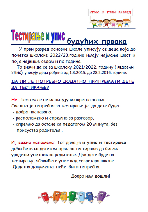 Почело је  тестирање будућих ђака првака, а истог дана је и упис првака у школску 2022-23. годину.