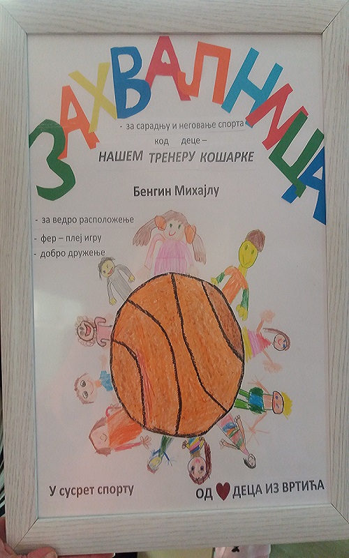 28.09.2018. одржана је угледна активност где су деца упозната са занимањем тренер кошарке. Васпитачи су са децом отишли до школске сале за физичко васпитање где их је сачекао тренер кошарке Михајло Бенгин. Деци је одржао један тренинг који се састојао од вежби загревања, такмичарске игре са лоптом, вођења лопте и шутирања на кош. Деца су пратила све инструкције како би што правилније савладала тренинг.