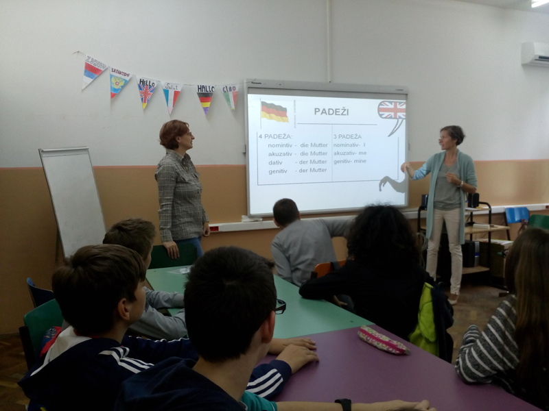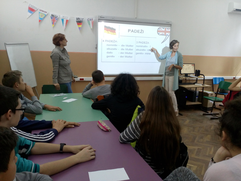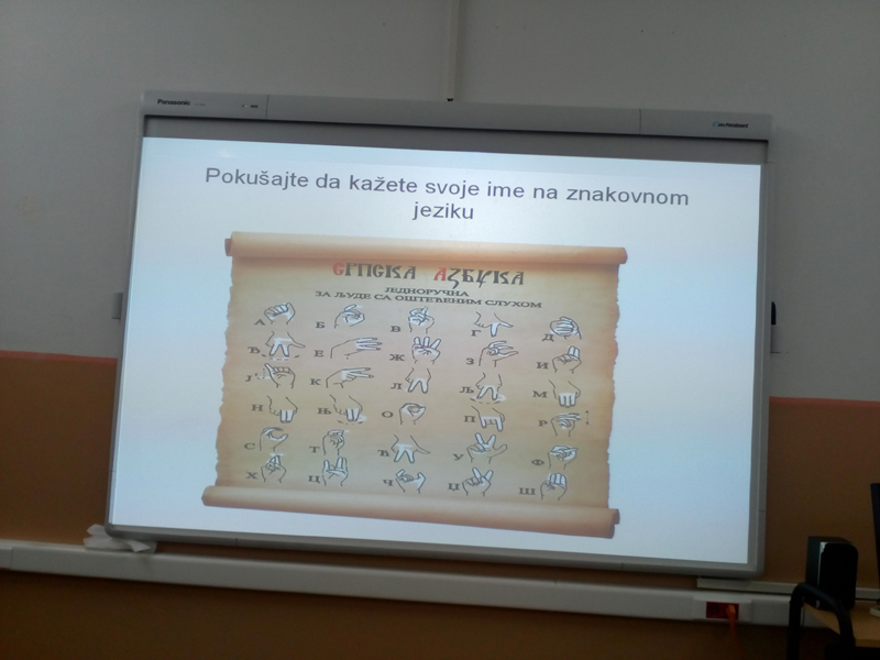 Обележили смо Дан европских језика прикладним угледним часовима  Стручног већа за страни језик. Наставнице: Виолета Перин,  Наташа Ковачевић, Јелена Ивковић и Јелена Галетин су врло занимљивим часовима, показали лепоту различитости а и разлике између  енглеског и немачког језика, а на једном од тих знаковни језик, односно садржај тог материјала за знаовни језик је посебно заинтересовао ученике.