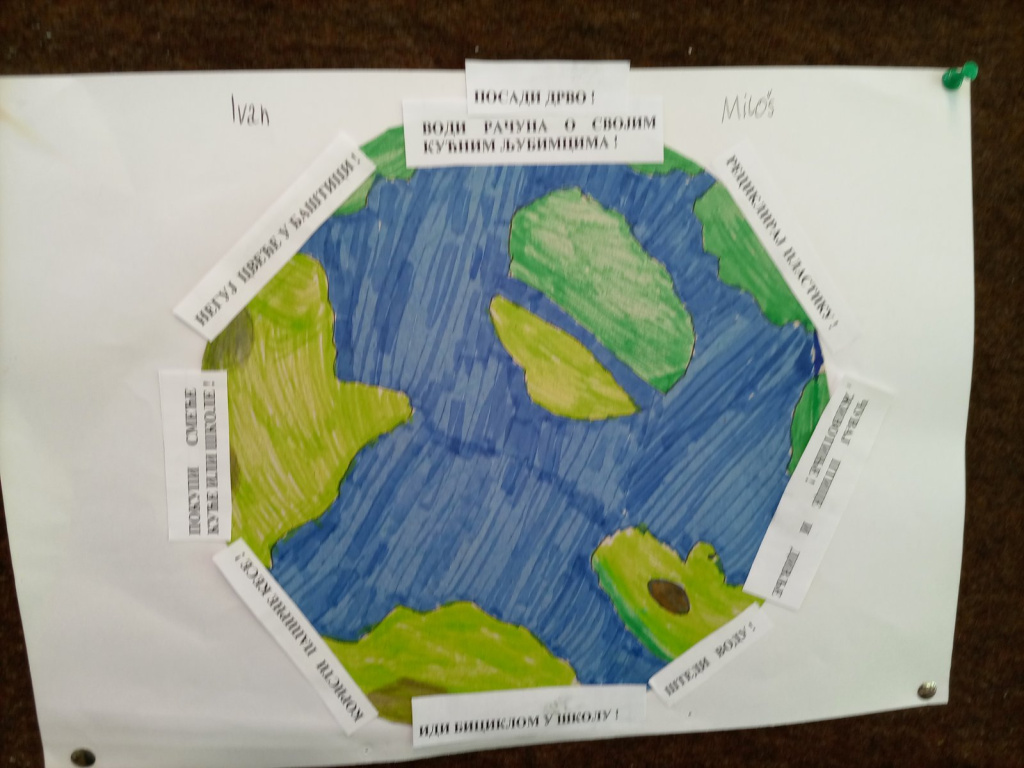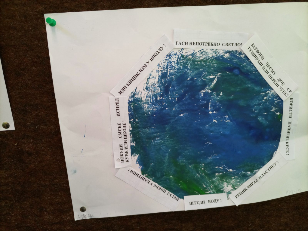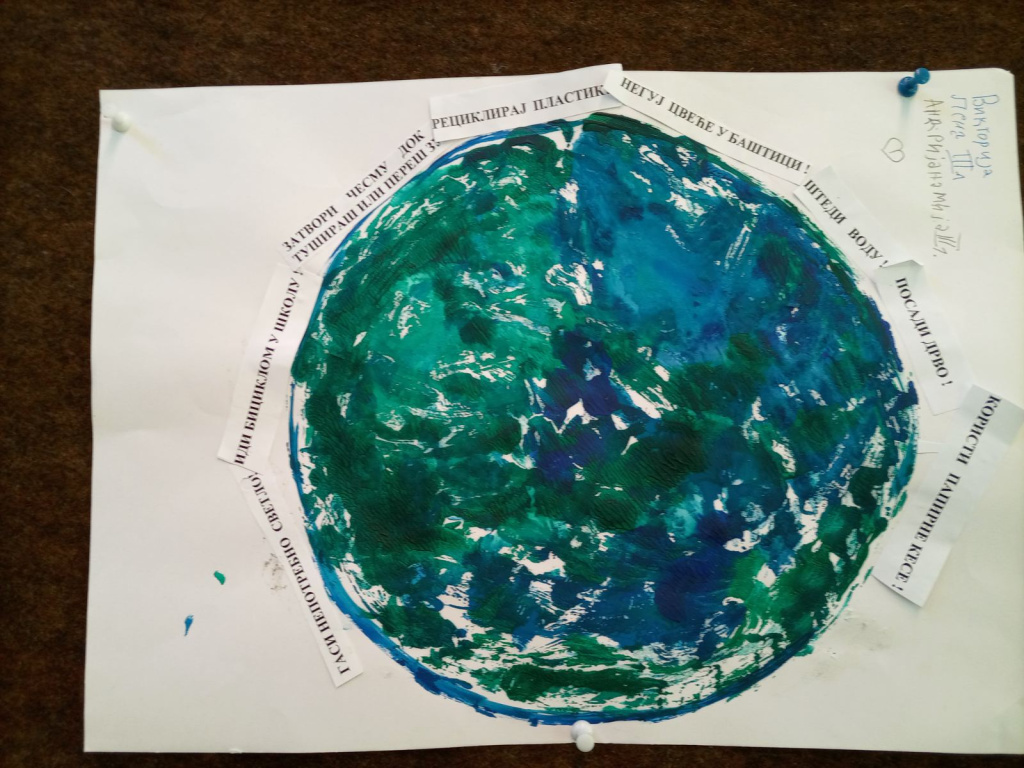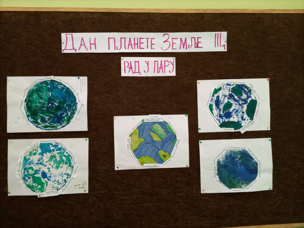 >Ученици 3-1 су радили у пару користећи нову технику - отисак темпером , и на тај начин направили планету Земљу. Заједнички су осмислили реченице на тему: Како сачувати планету Земљу, а потом отштампане поруке и залепили.