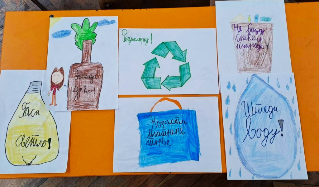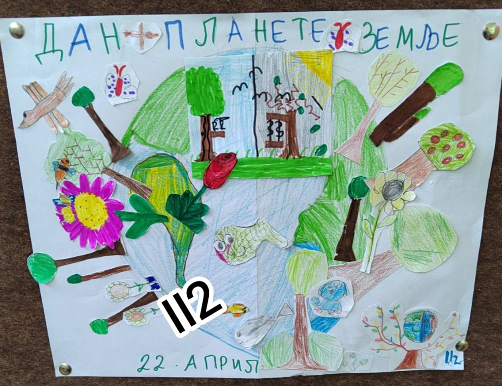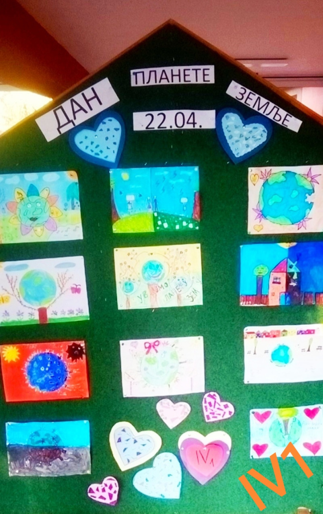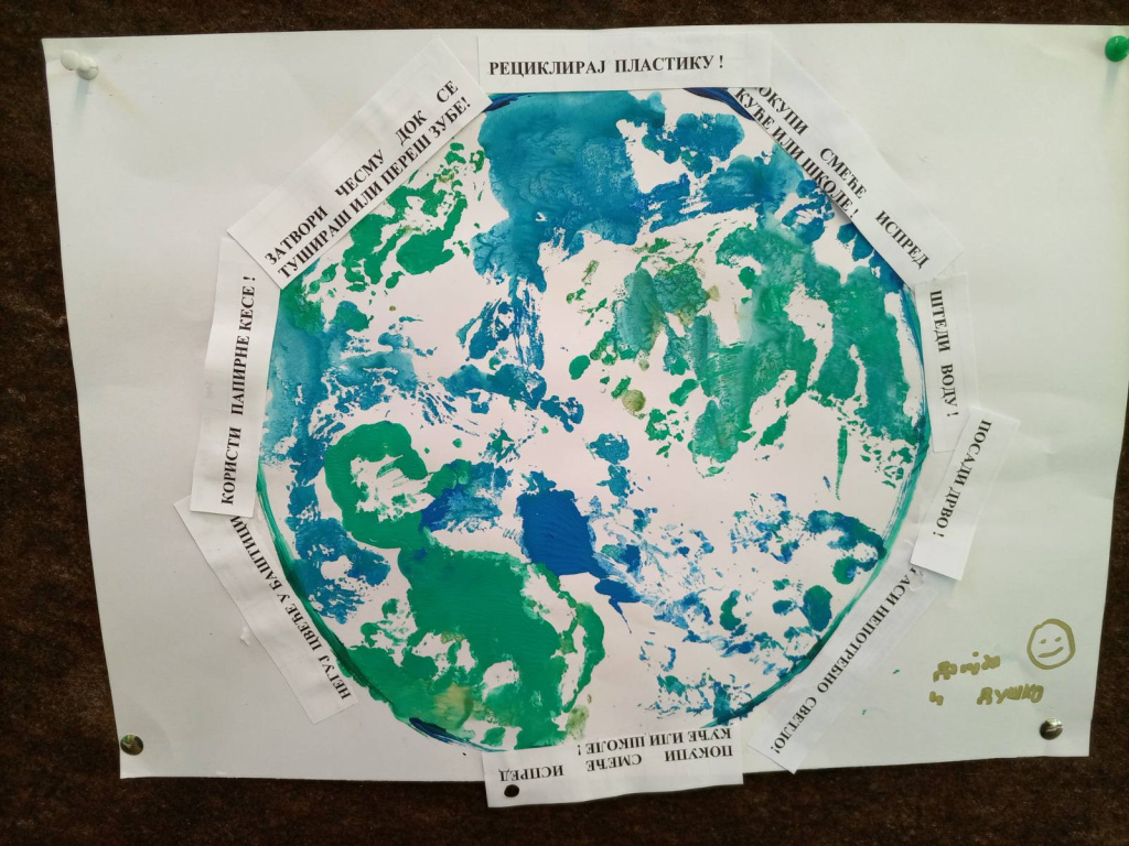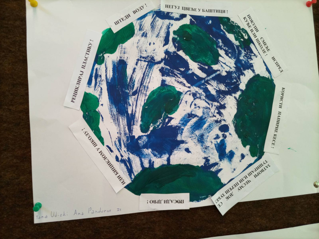 >Ученици 3-1 су радили у пару користећи нову технику - отисак темпером , и на тај начин направили планету Земљу. Заједнички су осмислили реченице на тему: Како сачувати планету Земљу, а потом отштампане поруке и залепили.