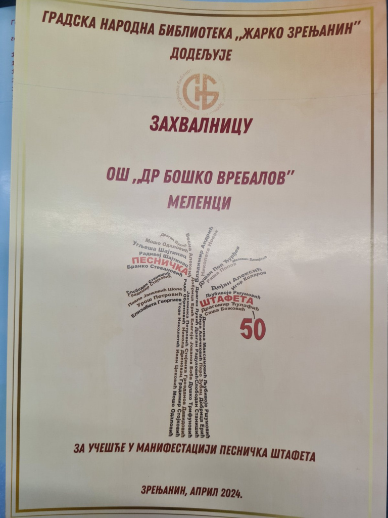 У понедељак, 8. априла је одржана Песничка штафета у нашој школи. Водитељ је био Урош Петровић који је анимирао ученике да размишљају, откривају и радују се успеху у решавању проблема. PesnickaStafeta24 viber_slika_2024-04-10_10-01-32-529.jpg viber_slika_2024-04-10_10-02-23-074.jpg viber_slika_2024-04-10_10-02-23-108.jpg viber_slika_2024-04-10_10-02-23-169.jpg viber_slika_2024-04-10_10-02-23-221.jpg viber_slika_2024-04-10_10-02-23-279.jpg viber_slika_2024-04-10_10-02-23-374.jpg viber_slika_2024-04-10_10-02-23-522.jpg viber_slika_2024-04-10_19-24-57-243.jpg viber_slika_2024-04-10_19-24-57-818.jpg viber_slika_2024-04-10_19-24-58-509.jpg viber_slika_2024-04-10_19-24-59-115.jpg
